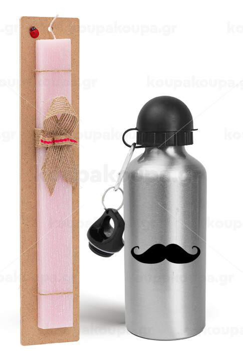 moustache, Easter Set, metallic Silver aluminum water bottle (500ml) & scented flat Easter candle (30cm) (PINK)