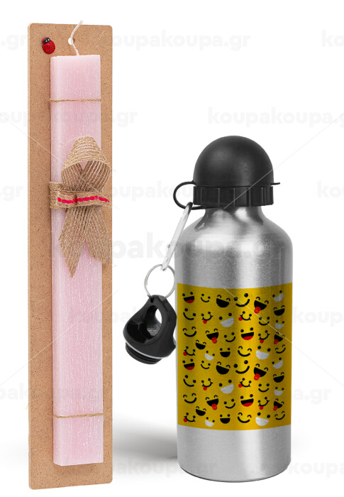 Smilies , Easter Set, metallic Silver aluminum water bottle (500ml) & scented flat Easter candle (30cm) (PINK)