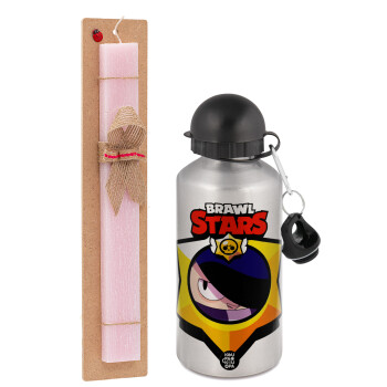 Brawl Stars Edgar, Easter Set, metallic Silver aluminum water bottle (500ml) & scented flat Easter candle (30cm) (PINK)