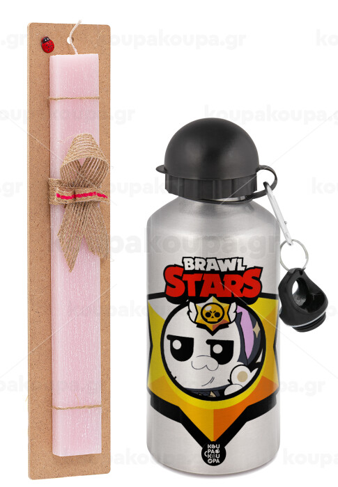 Brawl Stars Kit, Easter Set, metallic Silver aluminum water bottle (500ml) & scented flat Easter candle (30cm) (PINK)