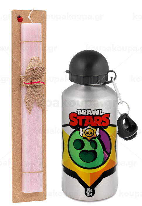 Brawl Stars Spike, Easter Set, metallic Silver aluminum water bottle (500ml) & scented flat Easter candle (30cm) (PINK)