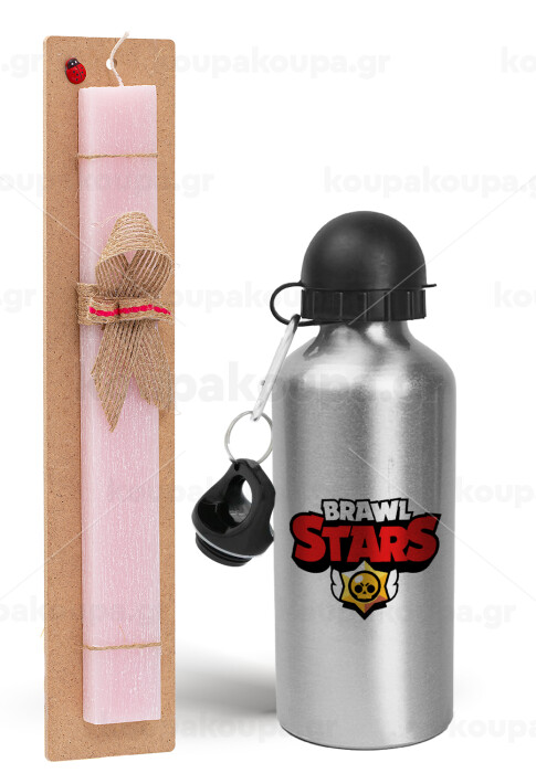 Brawl Stars, Easter Set, metallic Silver aluminum water bottle (500ml) & scented flat Easter candle (30cm) (PINK)