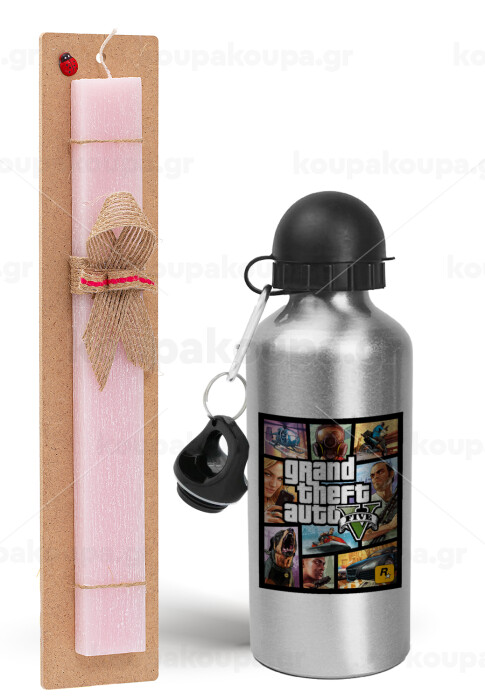 GTA V, Easter Set, metallic Silver aluminum water bottle (500ml) & scented flat Easter candle (30cm) (PINK)