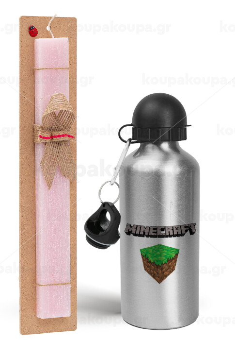 Minecraft dirt, Easter Set, metallic Silver aluminum water bottle (500ml) & scented flat Easter candle (30cm) (PINK)