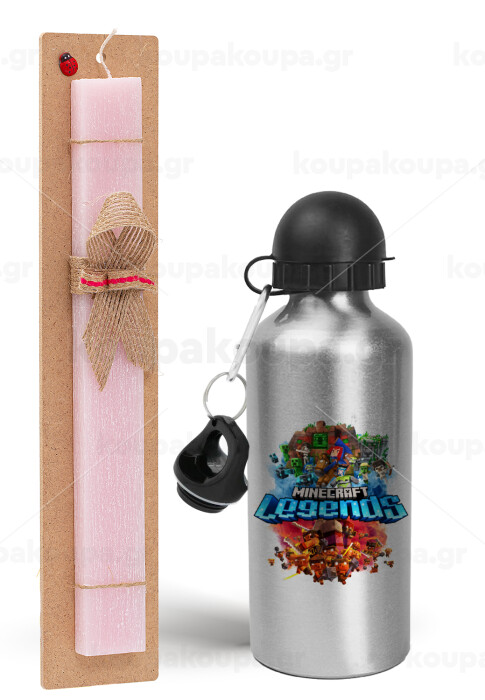 Minecraft legends, Easter Set, metallic Silver aluminum water bottle (500ml) & scented flat Easter candle (30cm) (PINK)