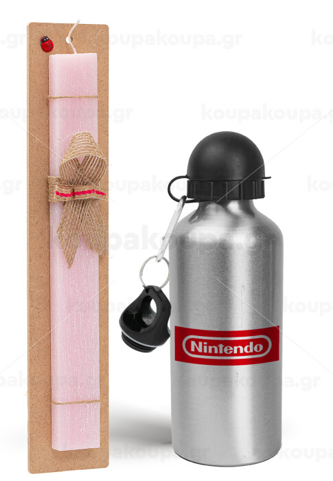 Nintendo, Easter Set, metallic Silver aluminum water bottle (500ml) & scented flat Easter candle (30cm) (PINK)