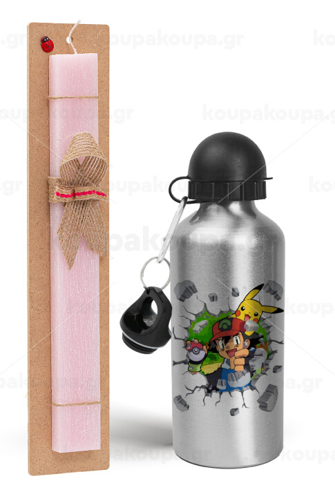 Pokemon brick, Easter Set, metallic Silver aluminum water bottle (500ml) & scented flat Easter candle (30cm) (PINK)