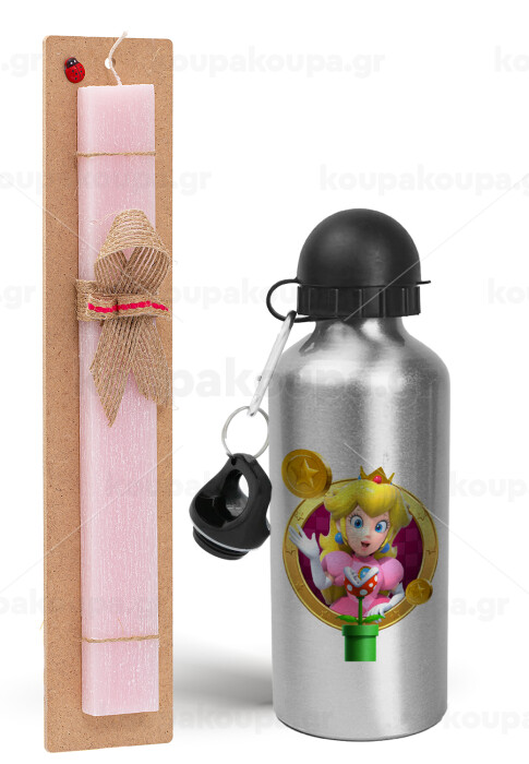 Princess Peach Toadstool, Easter Set, metallic Silver aluminum water bottle (500ml) & scented flat Easter candle (30cm) (PINK)