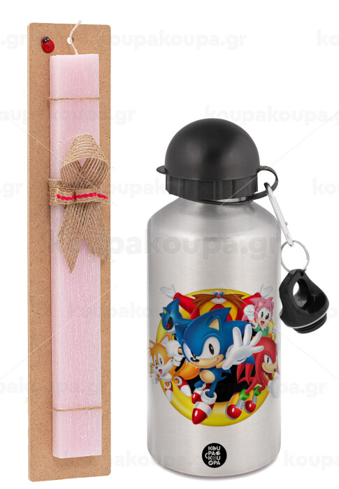 Sonic and friends, Easter Set, metallic Silver aluminum water bottle (500ml) & scented flat Easter candle (30cm) (PINK)