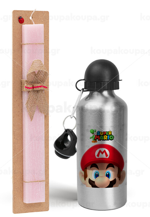 Super mario, Easter Set, metallic Silver aluminum water bottle (500ml) & scented flat Easter candle (30cm) (PINK)