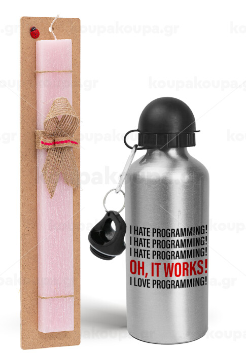 I hate programming!!!, Easter Set, metallic Silver aluminum water bottle (500ml) & scented flat Easter candle (30cm) (PINK)
