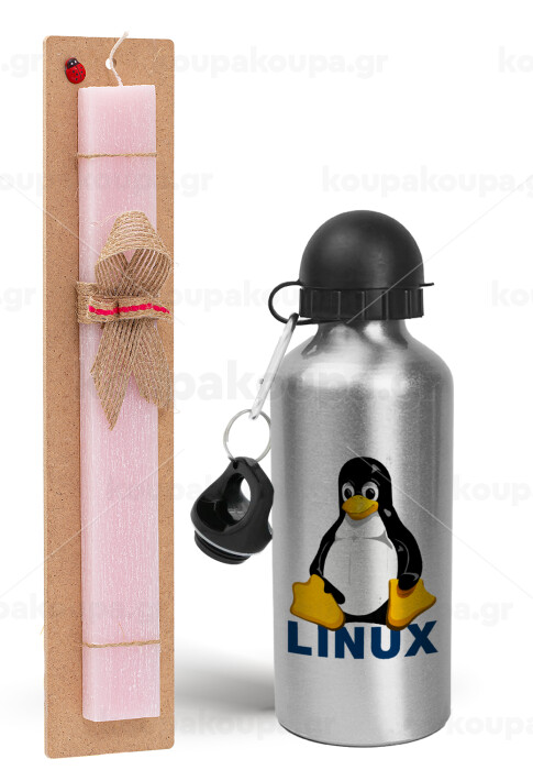 Linux, Easter Set, metallic Silver aluminum water bottle (500ml) & scented flat Easter candle (30cm) (PINK)