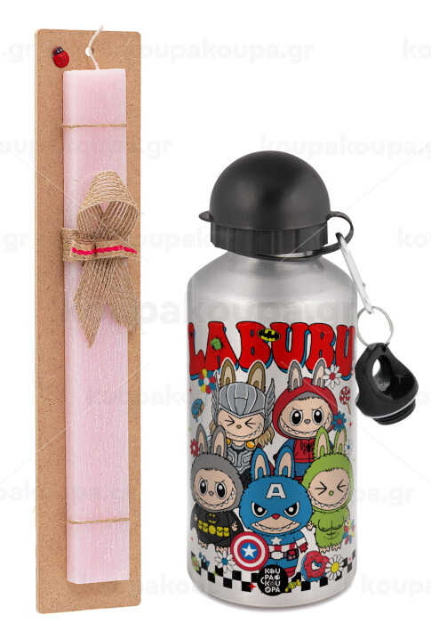 Labubu superheroes, Easter Set, metallic Silver aluminum water bottle (500ml) & scented flat Easter candle (30cm) (PINK)