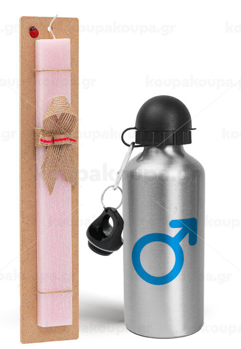 MALE, Easter Set, metallic Silver aluminum water bottle (500ml) & scented flat Easter candle (30cm) (PINK)