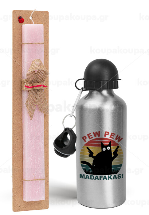 PEW PEW madafakas, Easter Set, metallic Silver aluminum water bottle (500ml) & scented flat Easter candle (30cm) (PINK)