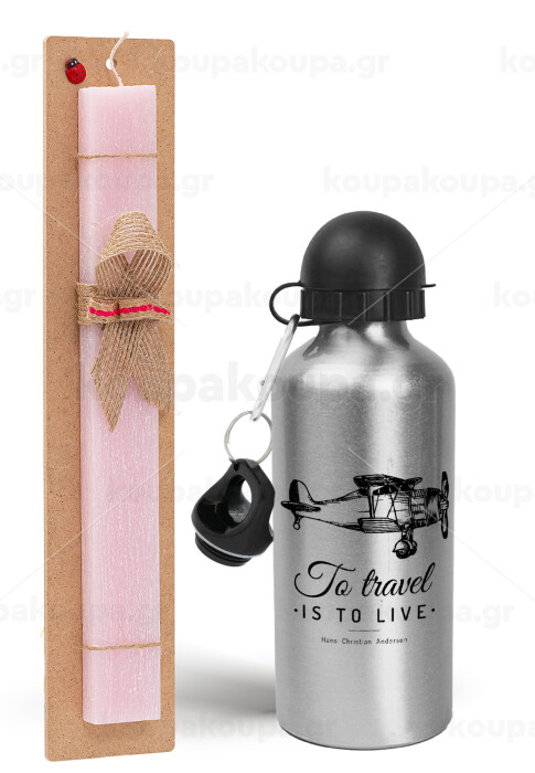 To travel is to live, Easter Set, metallic Silver aluminum water bottle (500ml) & scented flat Easter candle (30cm) (PINK)