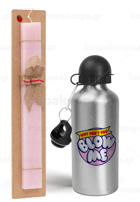 Why Don't You Blow Me Funny, Easter Set, metallic Silver aluminum water bottle (500ml) & scented flat Easter candle (30cm) (PINK)