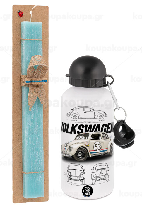 Volkswagen Beetle, Easter Set, metallic aluminum water bottle (500ml) & scented flat candle (30cm) (TURQUOISE)