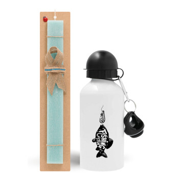 Fishing is fun, Easter Set, metallic aluminum water bottle (500ml) & scented flat candle (30cm) (TURQUOISE)
