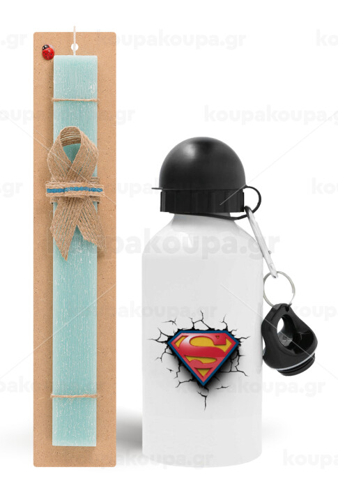 Superman cracked, Easter Set, metallic aluminum water bottle (500ml) & scented flat candle (30cm) (TURQUOISE)