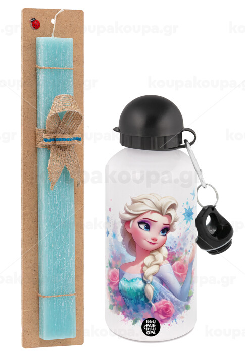 Elsa Princess, Easter Set, metallic aluminum water bottle (500ml) & scented flat candle (30cm) (TURQUOISE)