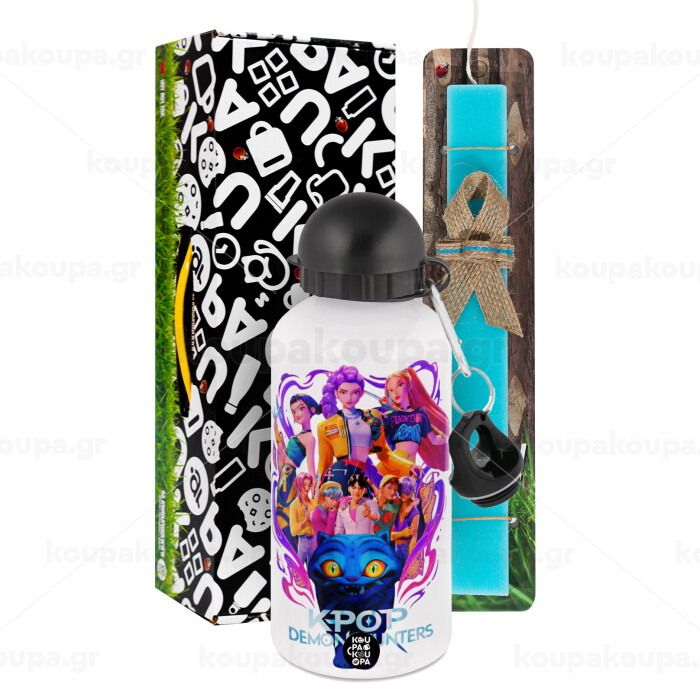 kpop Demon Hunters Huntrix, Easter Set, metallic aluminum water bottle (500ml) & scented flat candle (30cm) (TURQUOISE)