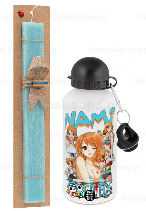 Nami One Piece, Easter Set, metallic aluminum water bottle (500ml) & scented flat candle (30cm) (TURQUOISE)