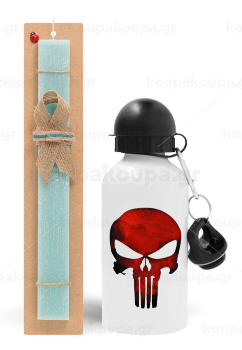 Red skull, Easter Set, metallic aluminum water bottle (500ml) & scented flat candle (30cm) (TURQUOISE)