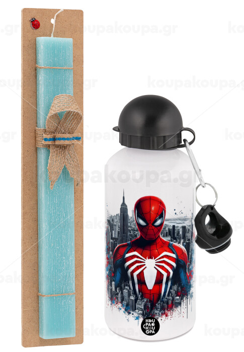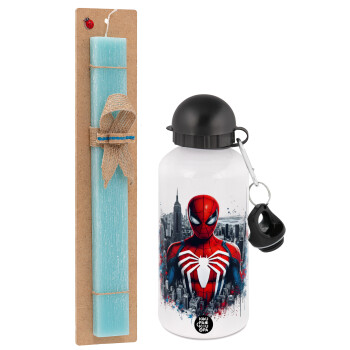 Spiderman City, Easter Set, metallic aluminum water bottle (500ml) & scented flat candle (30cm) (TURQUOISE)