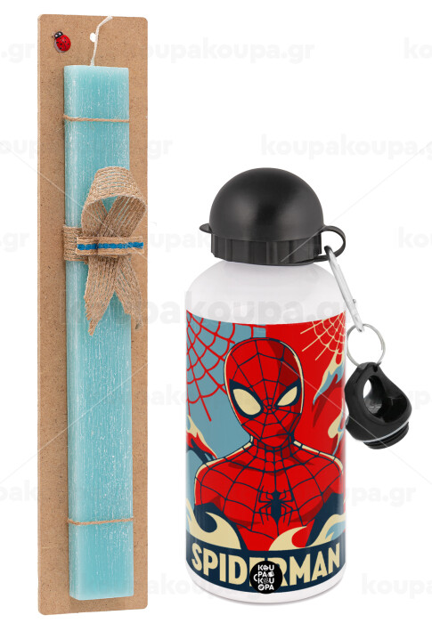 Spiderman kid, Easter Set, metallic aluminum water bottle (500ml) & scented flat candle (30cm) (TURQUOISE)