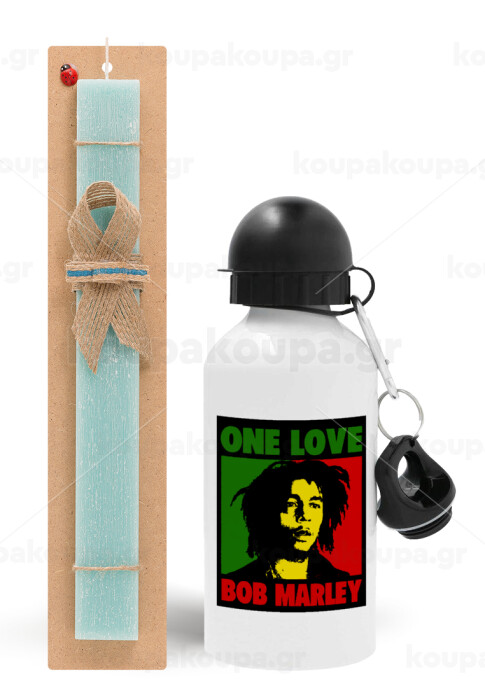 Bob marley, one love, Easter Set, metallic aluminum water bottle (500ml) & scented flat candle (30cm) (TURQUOISE)