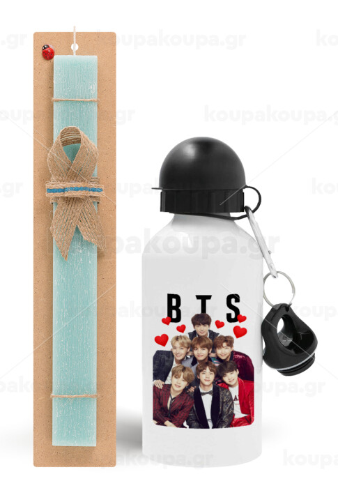 BTS hearts, Easter Set, metallic aluminum water bottle (500ml) & scented flat candle (30cm) (TURQUOISE)