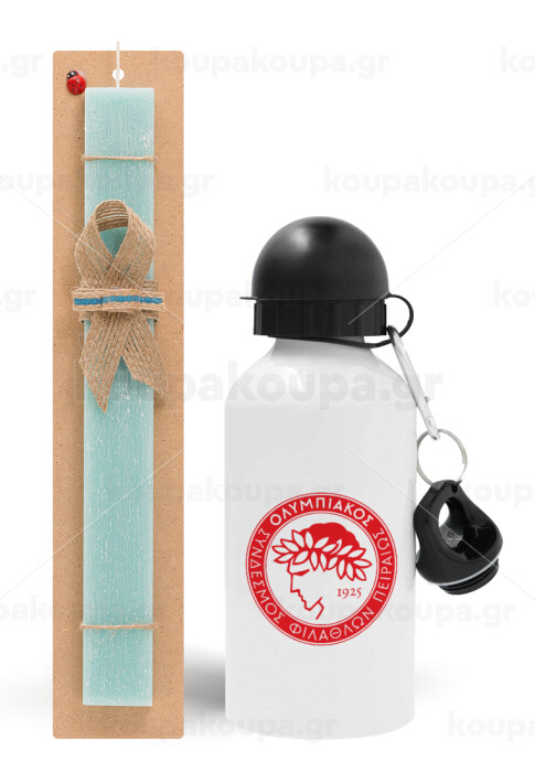 Ολυμπιακός, Easter Set, metallic aluminum water bottle (500ml) & scented flat candle (30cm) (TURQUOISE)