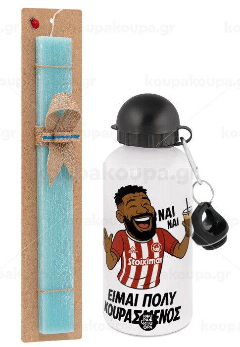 Ροντινέι, "ΠΟΛΥ ΚΟΥΡΑΣΜΕΝΟΣ", Easter Set, metallic aluminum water bottle (500ml) & scented flat candle (30cm) (TURQUOISE)