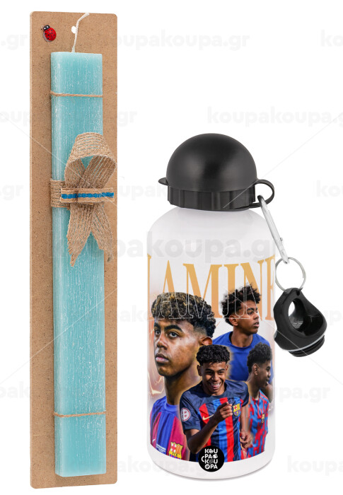 lamine yamal FCB, Easter Set, metallic aluminum water bottle (500ml) & scented flat candle (30cm) (TURQUOISE)