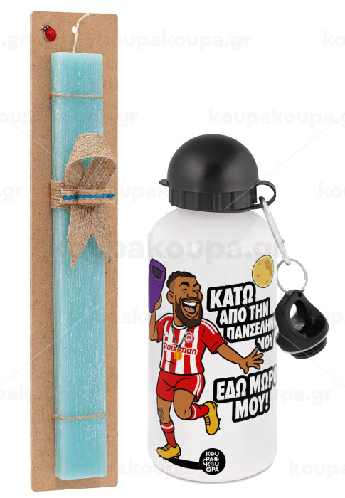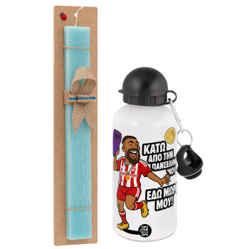 Ροντινέι, "ΚΑΤΩ ΑΠΟ ΤΗΝ ΠΑΝΣΕΛΗΝΟ ΜΟΥ!", Easter Set, metallic aluminum water bottle (500ml) & scented flat candle (30cm) (TURQUOISE)