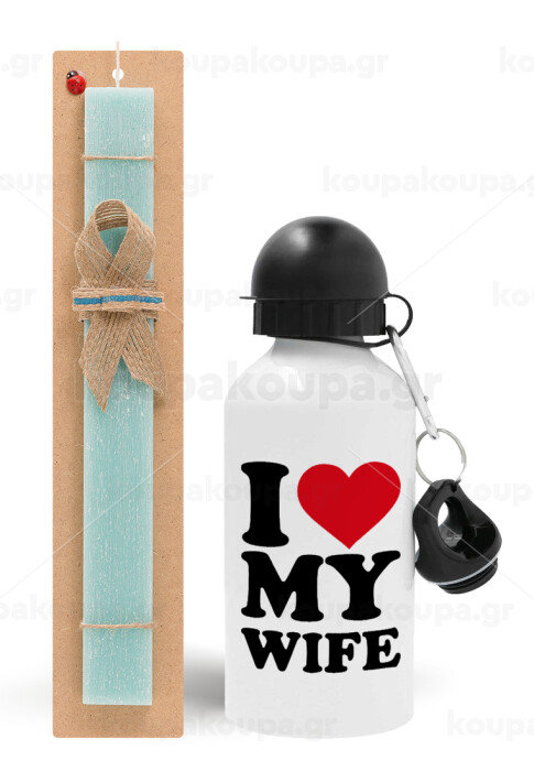 I Love my Wife, Easter Set, metallic aluminum water bottle (500ml) & scented flat candle (30cm) (TURQUOISE)