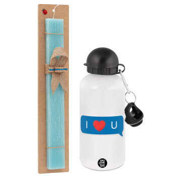 I Love You text message, Easter Set, metallic aluminum water bottle (500ml) & scented flat candle (30cm) (TURQUOISE)