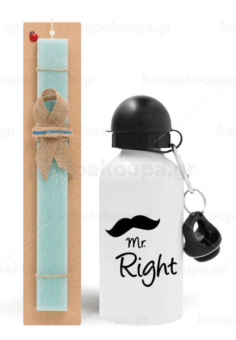 Mr right Mustache, Easter Set, metallic aluminum water bottle (500ml) & scented flat candle (30cm) (TURQUOISE)