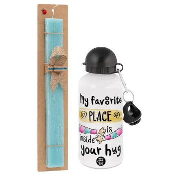 My favorite place is inside your HUG, Easter Set, metallic aluminum water bottle (500ml) & scented flat candle (30cm) (TURQUOISE)