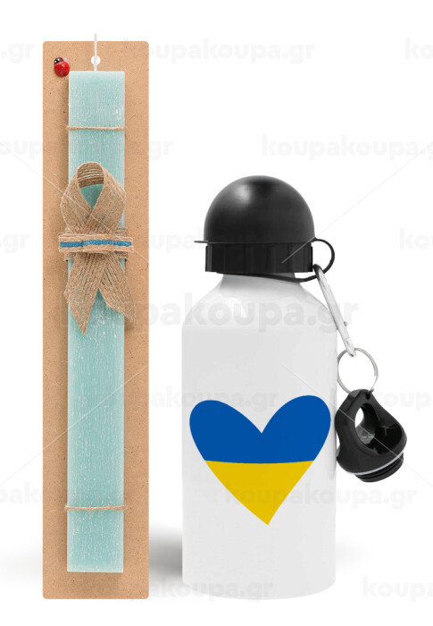 UKRAINE heart, Easter Set, metallic aluminum water bottle (500ml) & scented flat candle (30cm) (TURQUOISE)