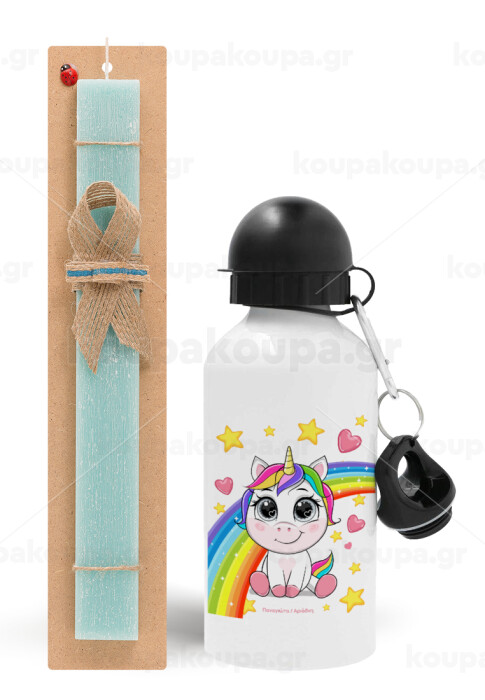Unicorn baby με όνομα, Easter Set, metallic aluminum water bottle (500ml) & scented flat candle (30cm) (TURQUOISE)