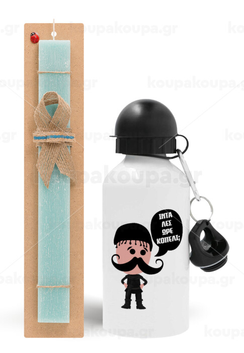 Κρητικός "Ίντα λες ωρέ κοπέλι", Easter Set, metallic aluminum water bottle (500ml) & scented flat candle (30cm) (TURQUOISE)