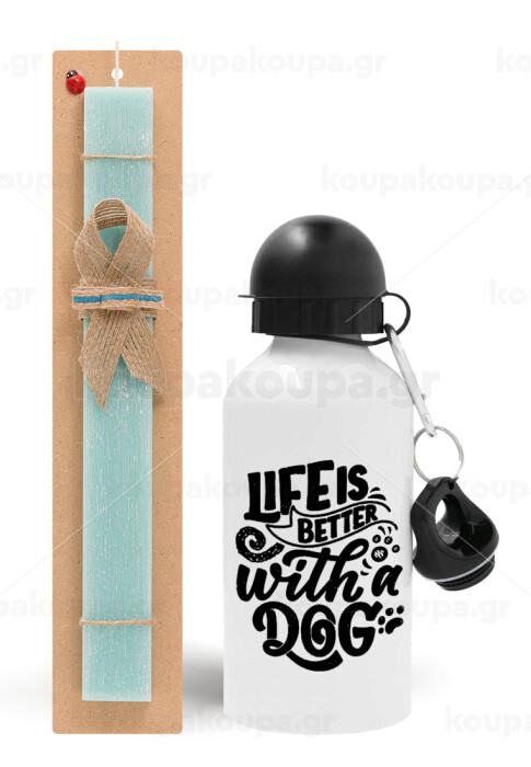 Life is better with a DOG, Easter Set, metallic aluminum water bottle (500ml) & scented flat candle (30cm) (TURQUOISE)