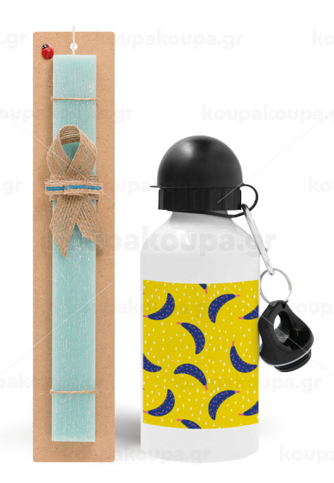 Yellow seamless with blue bananas, Easter Set, metallic aluminum water bottle (500ml) & scented flat candle (30cm) (TURQUOISE)