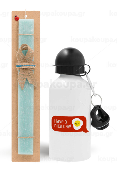 Have a nice day Emoji, Easter Set, metallic aluminum water bottle (500ml) & scented flat candle (30cm) (TURQUOISE)