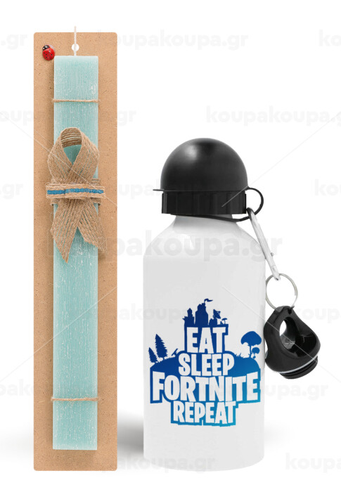 Eat Sleep Fortnite Repeat, Easter Set, metallic aluminum water bottle (500ml) & scented flat candle (30cm) (TURQUOISE)