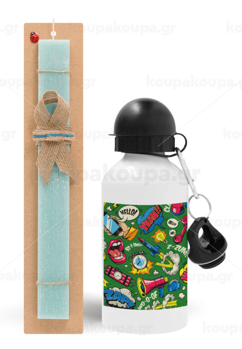 Pop art colorful seamless, Easter Set, metallic aluminum water bottle (500ml) & scented flat candle (30cm) (TURQUOISE)
