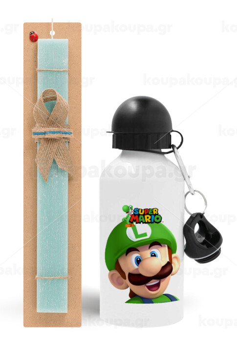 Super mario Luigi, Easter Set, metallic aluminum water bottle (500ml) & scented flat candle (30cm) (TURQUOISE)