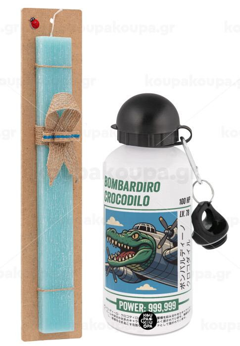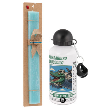 Bombardiro Crocodilo, Easter Set, metallic aluminum water bottle (500ml) & scented flat candle (30cm) (TURQUOISE)